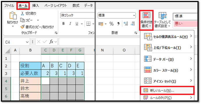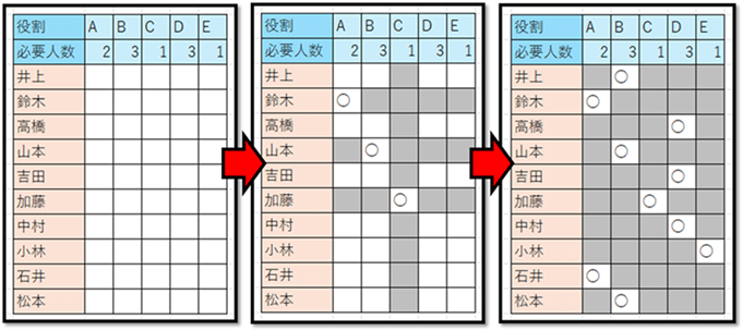 こちらでは、以下の左側の「セルの結合を含む表」から、セルの結合を含まない状態で右側の表に抽出していきます。