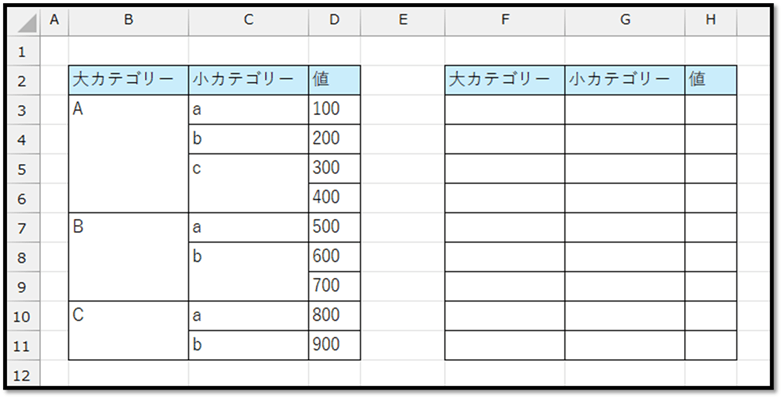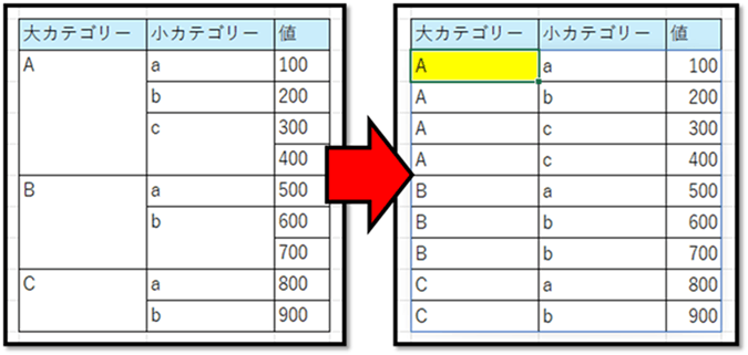 | 大カテゴリーの先頭のセルから順番に確認し、 ・セルが空でない場合は、そのまま値を抽出 ・セルが空の場合は、1つ前に抽出した値を抽出 |