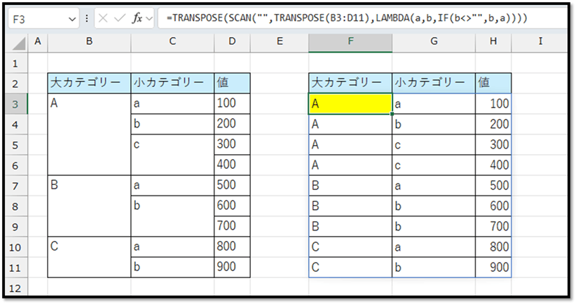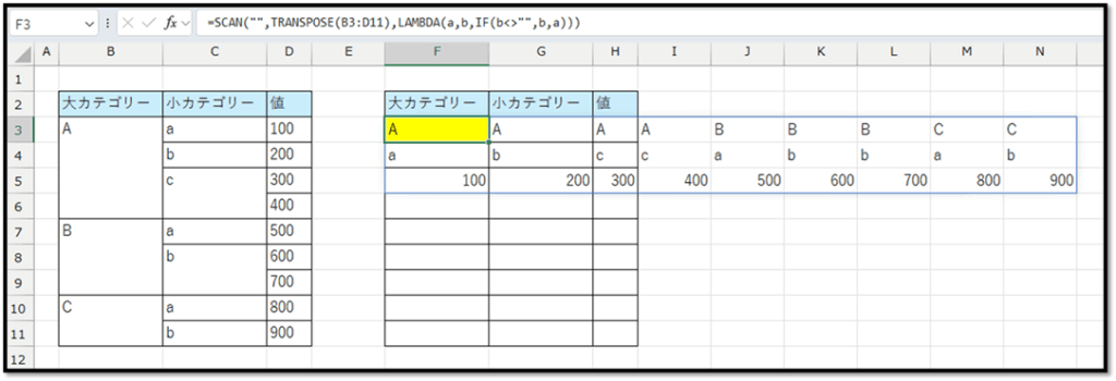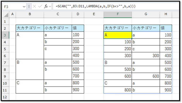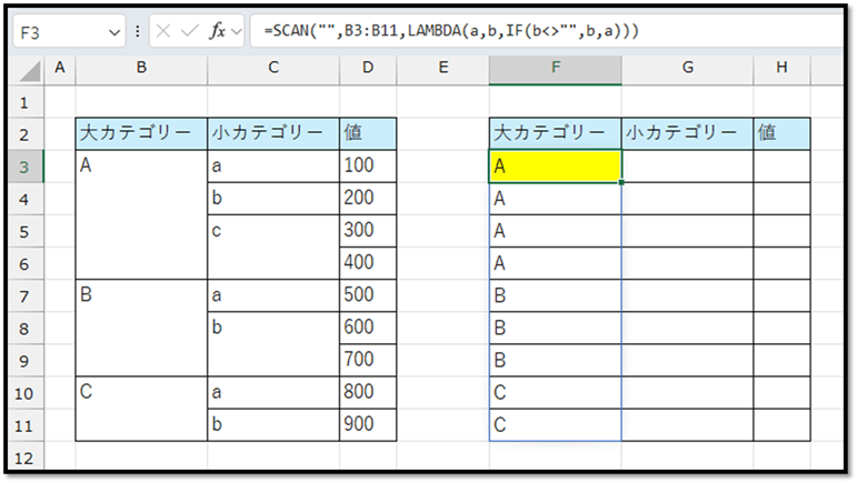 まずは、先頭の「大カテゴリー」をセルの結合を含まない状態で抽出する場合、SCAN関数を用いて、以下の法則で抽出する必要があります。
