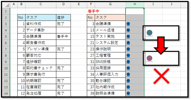 以下の表のように、チェックボックスにチェックすると同時に、その行が自動で非表示になる仕組みを実現する方法について解説していきます。