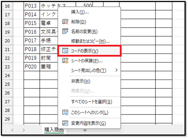 シートモジュールは、該当するシートのタブ上で右クリックし、[コードの表示]を選択することで表示できます。