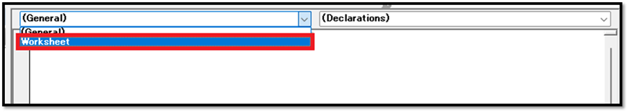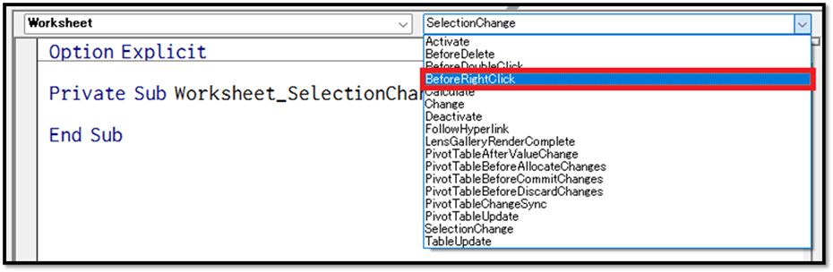 そのためには、シートモジュールの左上のリストから「Worksheet」を選択します。