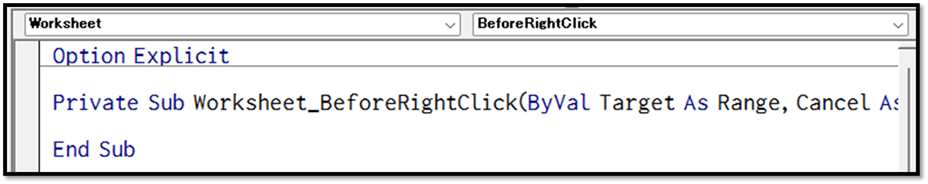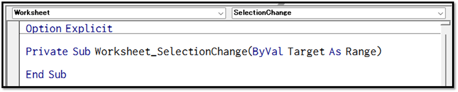「Worksheet」を選択すると、自動で「Worksheet_SelectionChange」というプロシージャが表示されます。