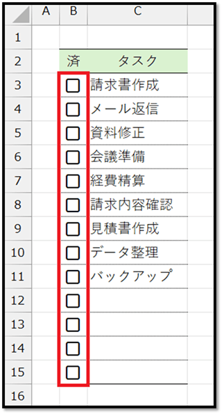 あらかじめ、「済」の項目にチェックボックスを用意しています。