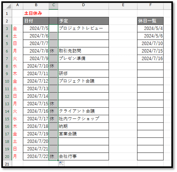抽出方法は、該当する担当者(田中)が存在するのかどうかを判断し、存在する場合は、該当する曜日(月)の上から何番目に位置するのかを取得し、その行の担当(C)を抽出するという方法になります。