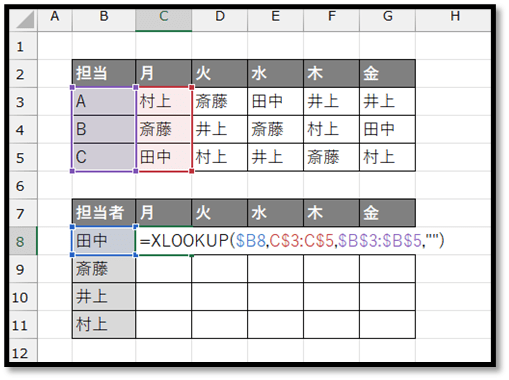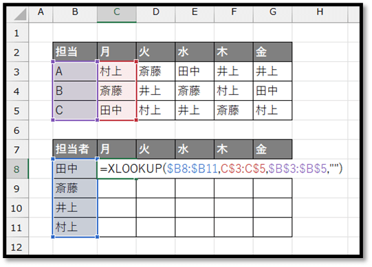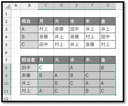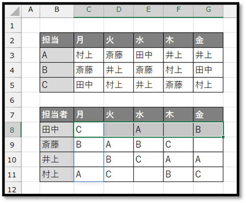 こちらでは、「担当(A、B、C)と曜日別に担当者(田中、斎藤、井上、村上)を表した表」を元に、「担当者と曜日別に担当を表した表」に数式で抽出してきます。