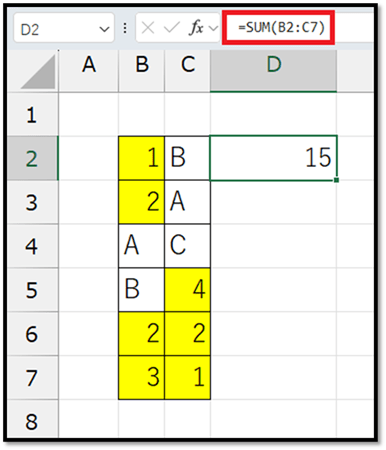 // D2:D7:合計する項目