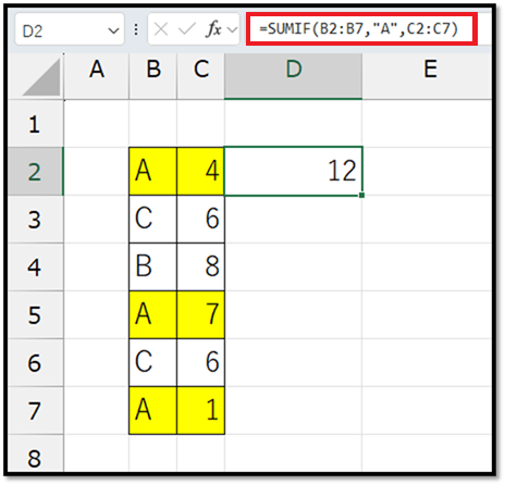 =SUMIF(B2:B7,"A",C2:C7)