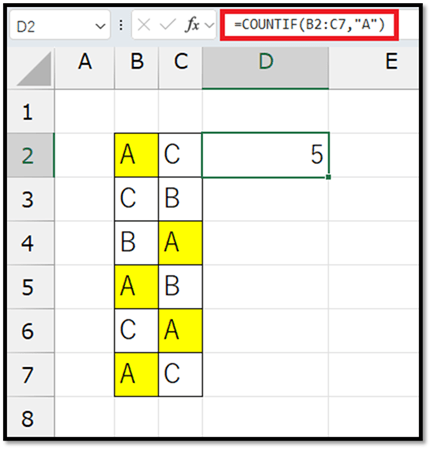 =COUNTIF(B2:C7,"A")