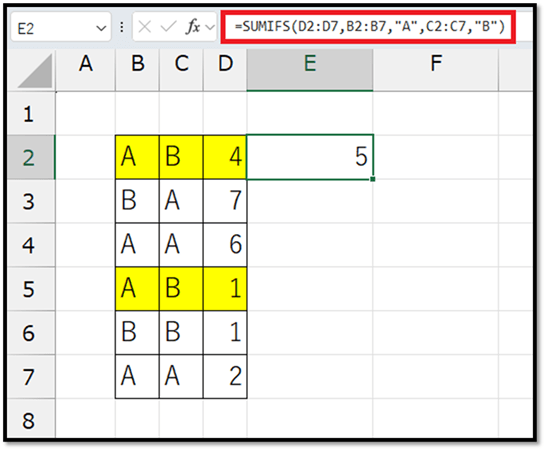 =SUMIFS(D2:D7,B2:B7,"A",C2:C7,"B")