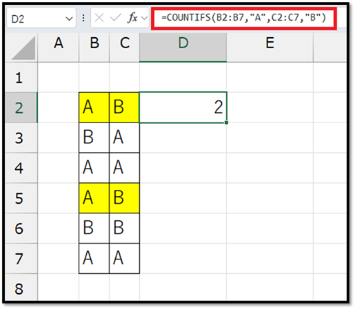 =COUNTIFS(B2:B7,"A",C2:C7,"B")