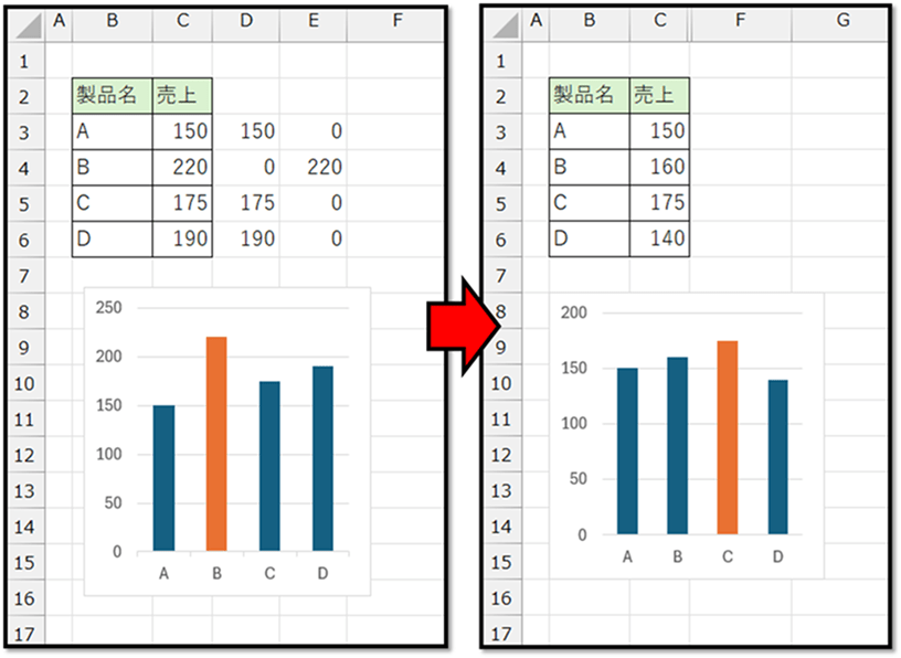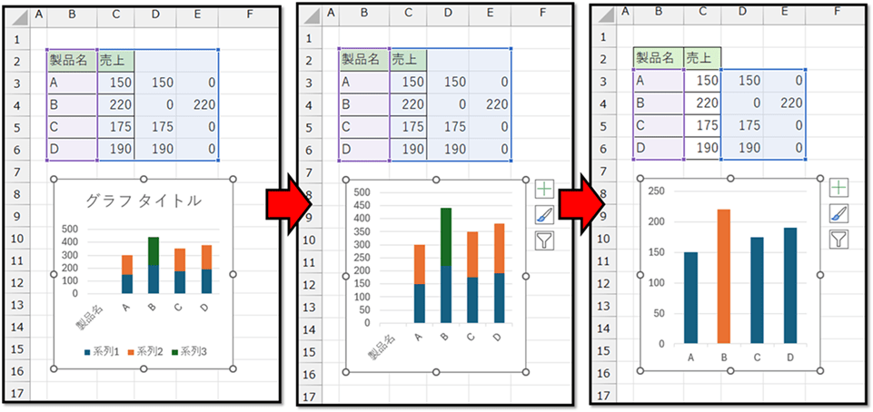 必要に応じて、グラフのサイズなどを修正し、グラフのデータ範囲を先ほど作成した表のみに変更することで、グラフの完成です。