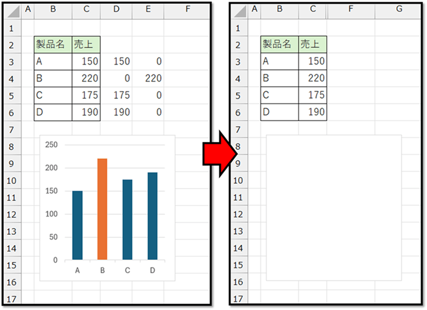 以上の設定を行うことで、作成した表を非表示にしたとしても、グラフのデータは表示されたままになります。