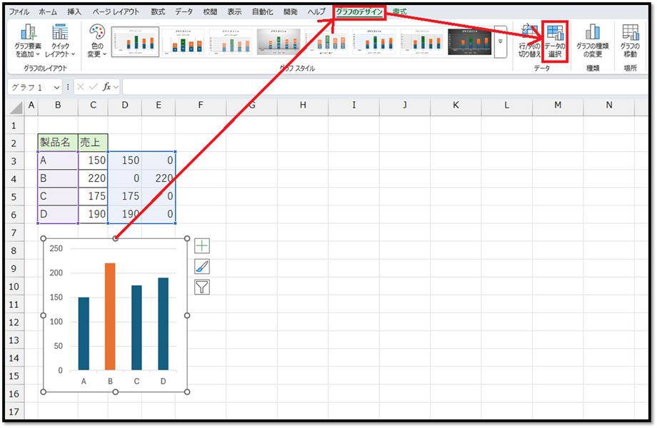 作成した表を非表示にしたい場合は、グラフを選択して、[グラフのデザイン]タブから[データの選択]を選択します。