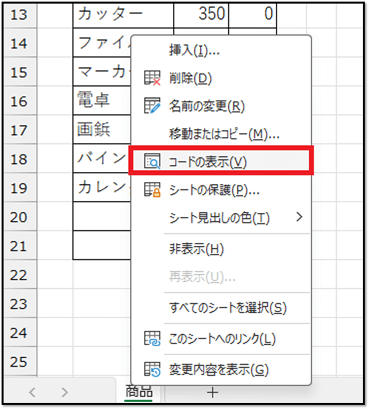 シートモジュールは、該当するシートのタブ上で右クリックし、[コードの表示]を選択することで表示することができます。