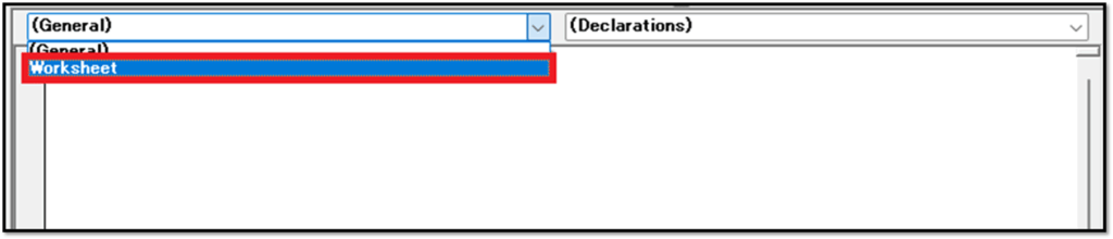 そのためには、シートモジュールの左上のリストから「Worksheet」を選択します。