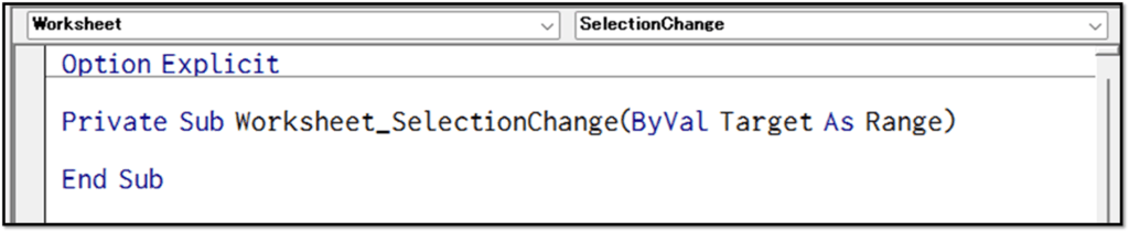 このプロシージャは、該当するシート上のいずれかのセルが選択されると同時に処理が実行されるイベントプロシージャになります。
