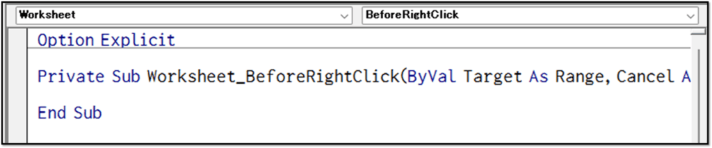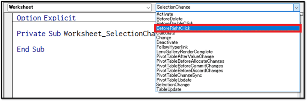 表示された「Worksheet_BeforeRightClick」というプロシージャを活用します。