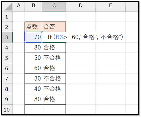 以下の表の「合否」の項目には、数式が入力されています。