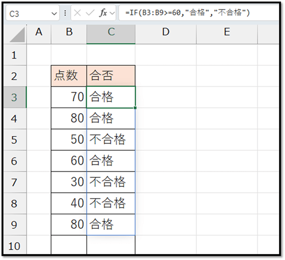 =IF(B3:B9>=60,"合格","不合格")