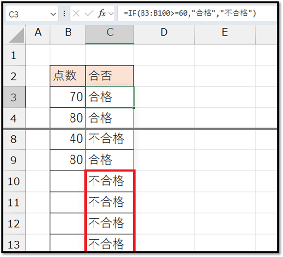 =IF(B3:.B100>=60,"合格","不合格")