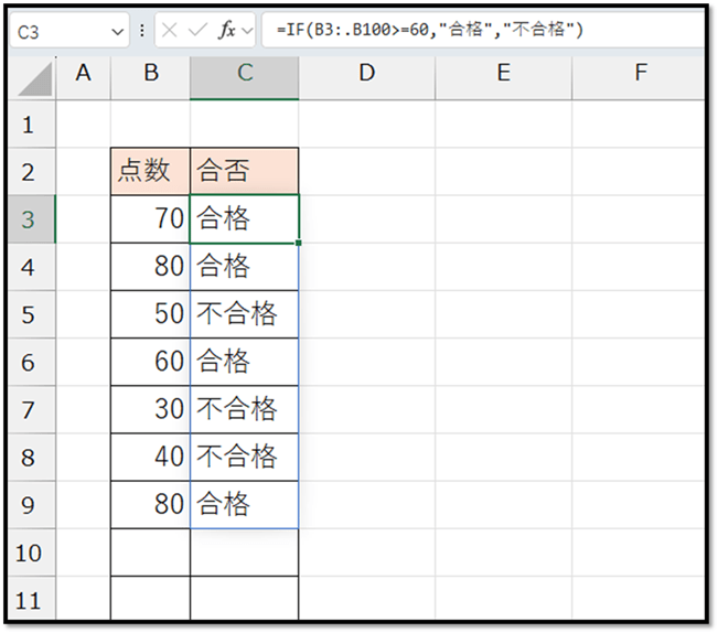 そのため、「合否」の先頭のセルに、以下のスピルを活用した数式を入力します。