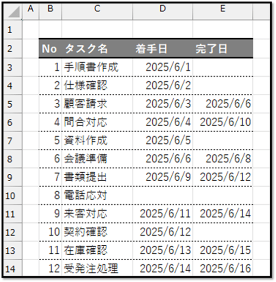 今回の場合、以下の表の、完了日の項目に値が入力されているタスクが「完了したタスク」になります。
