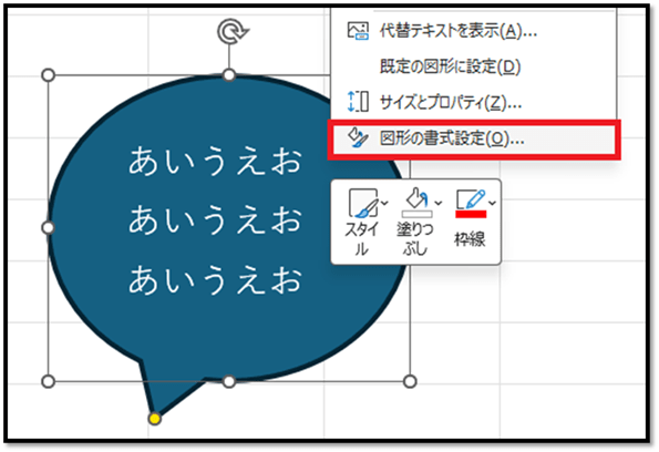 まずは、対象の図形の書式設定を開きます。