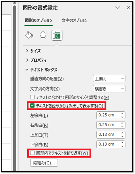 次に、[サイズとプロパティ]の[テキストボックス]を展開して、[テキストを図形からはみ出して表示する]にチェックし、[図形内でテキストを折り返す]のチェックを外します。