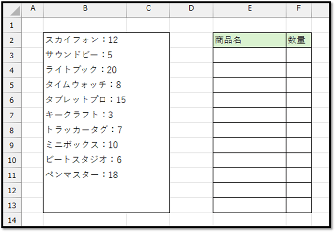以下のように、メールなどで送られてきた文章(B2:D16)から特定の値を表形式で抽出(F3:G7)する方法について紹介していきます。