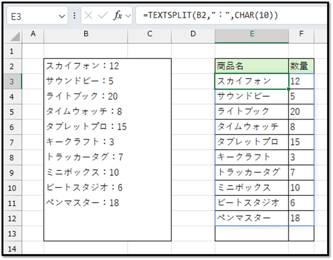 このルール通りに抽出するためには、TEXTSPLIT関数を活用します。