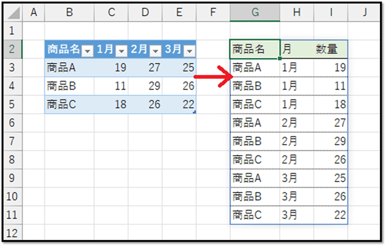 ※テーブルにしなくても変換できますが、データの増減にも対応させる場合は、テーブルにした方がよいです。