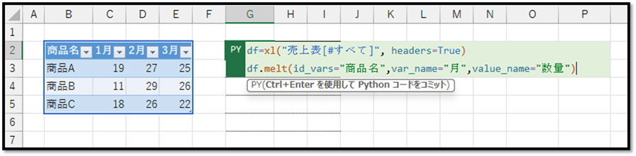 以上のコードでは、テーブル(売上表)の内容をデータフレームに格納し、そのデータフレームの「melt」という機能を活用して、変換したい1行1データの表形式の情報を指定しています。