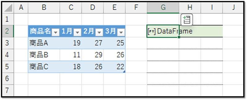 変換結果はデータフレームとして返ってくるため、「Ctrlキーを押しながらEnterキー」で確定すると、以下のように「DataFrame」と表示されます。