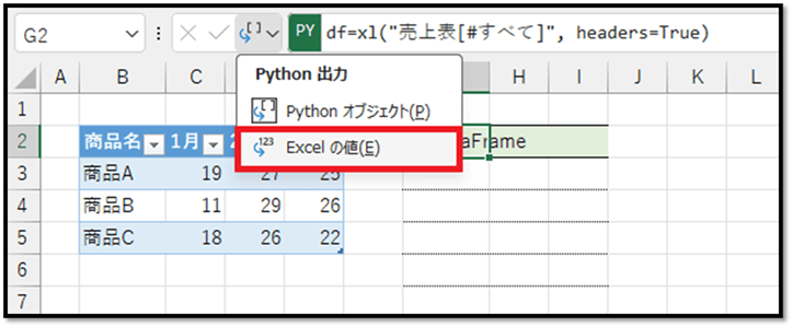 最後に、データフレームの内容をセルに展開するために、「数式バーの隣のアイコンを[Excelの値]に変更」もしくは「Ctrlキー+Shiftキー+Altキー+Mキー」を押します。