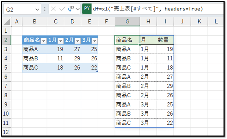 「Python in Excel」という機能を使って、以下のように、クロス表(マトリックス表)を1行1データの表形式にリアルタイムで変換する方法について紹介します。