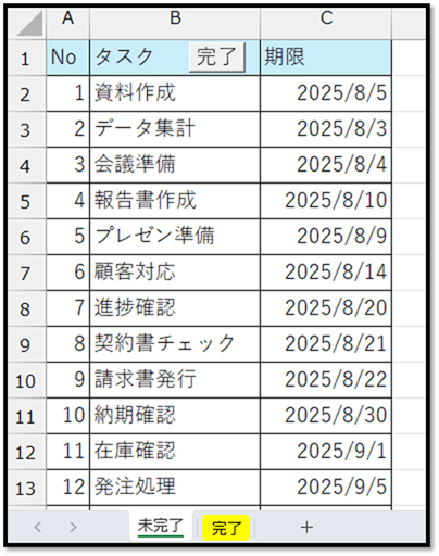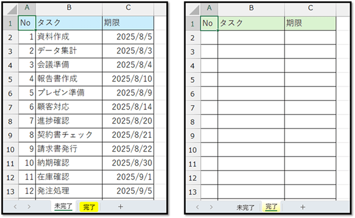 まずは、「未完了」シートと「完了」シートを用意し、「完了」シートには空の表を用意します。