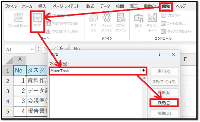 次に、[開発]タブから[マクロ]を選択し、表示された設定画面にて、開発する機能の名前を入力して、[作成]を選択します。