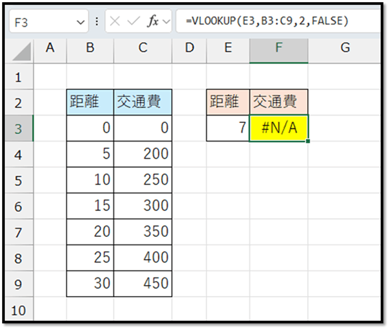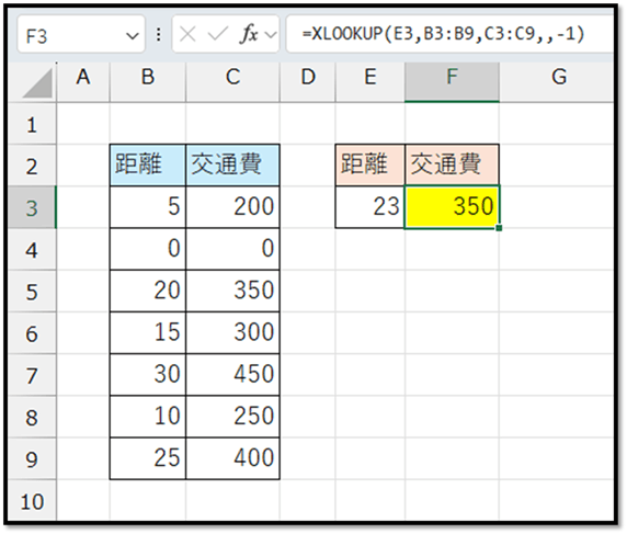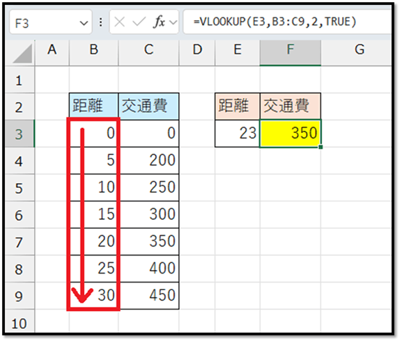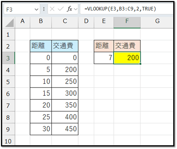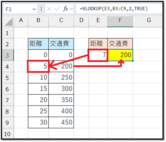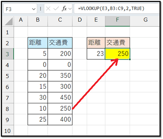 以下は、距離と交通費の関係を表した表から、指定した距離の交通費を抽出する数式になります。