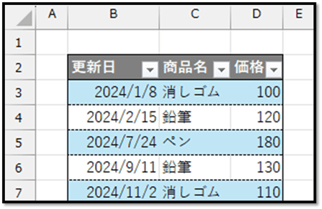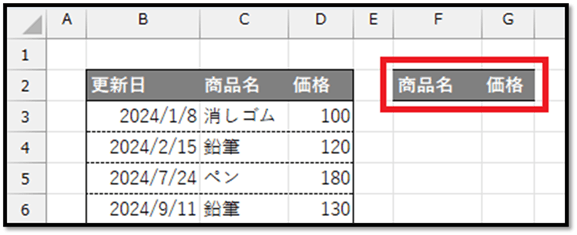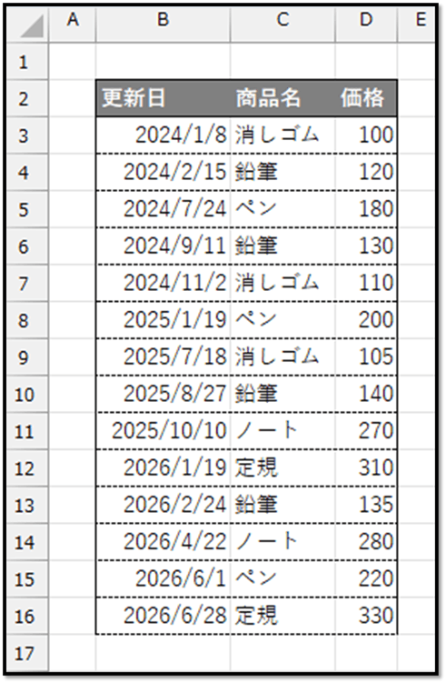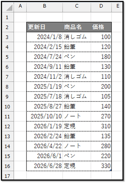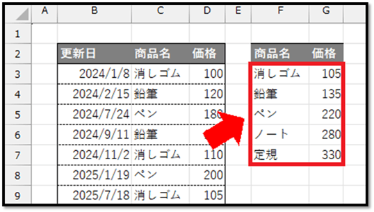 この表から、数式だけで各商品の最新価格を抽出する方法について解説していきます。