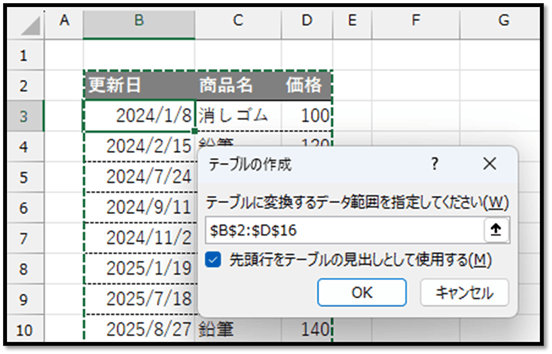 指定されている範囲が正しいことを確認し、表の先頭行が見出し行のため、[先頭行をテーブルの見出しとして使用する]にチェックした状態で確定します。