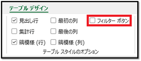 フィルターボタンが不要な場合は、フィルターボタンのチェックを外しておきます。