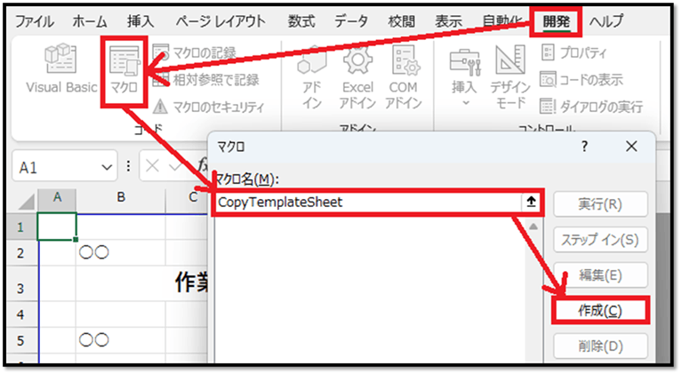 ファイルの用意ができたら、[開発]タブから[マクロ]を選択し、表示された設定画面に「開発する機能の名前」を入力して[作成]を選択します。